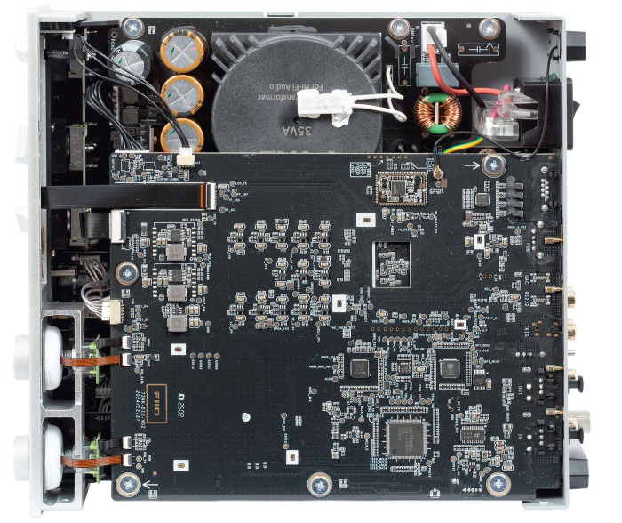 Wzmacniacz słuchawkowy to rozbudowany układ z elementami dyskretnymi, pracujący w klasie A. każdego kanału. Niewykluczone, że FiiO ustawiło te układy w trybie mono (bo są dwa), co oznaczałoby dynamikę na poziomie aż 138 dB, ale bardziej racjonalna wydaje się konfiguracja stereo (wówczas dynamika to "tylko" 135 dB) pozwalająca uzyskać sygnał zbalansowany już na tym etapie. W części analogowej pracują wzmacniacze operacyjne.