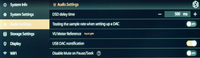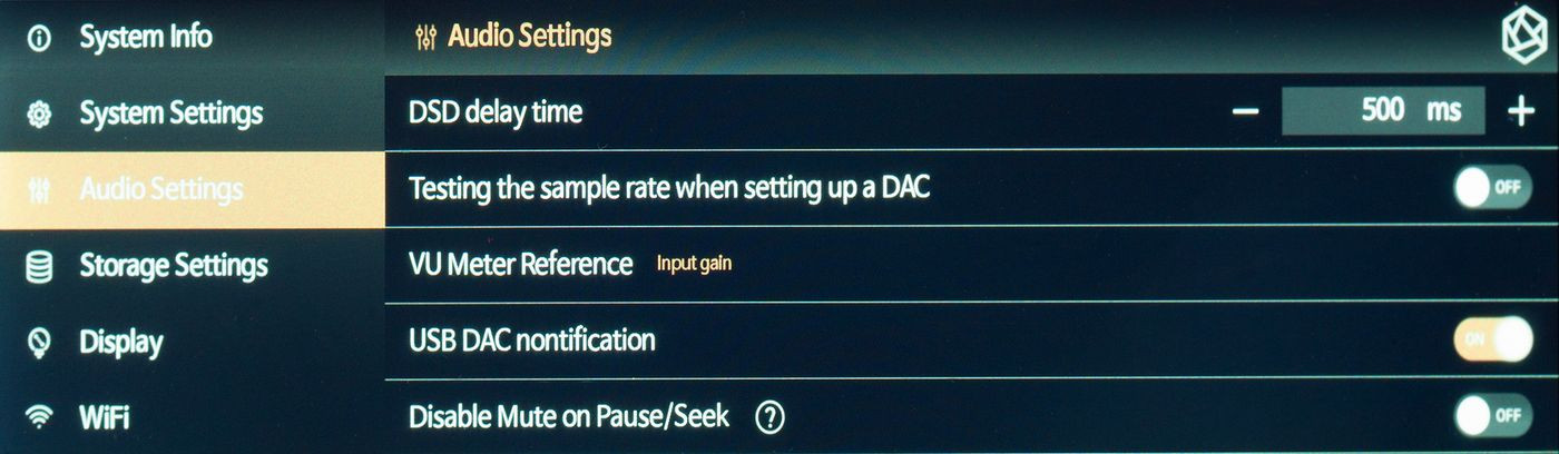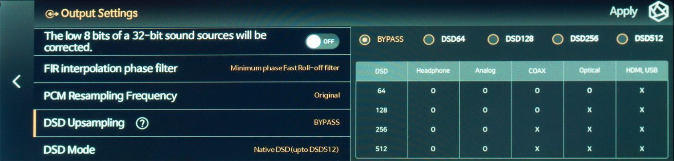 Mamy też mnóstwo ustawień w sferze audio, na czele z wyborem trybów filtrowania cyfrowego (siedem wariantów, zaszytych w przetworniku C/A). Są też zaawansowane upsamplery, które sygnał PCM potrafią przekonwertować np. na DSD (nawet do DSD512).