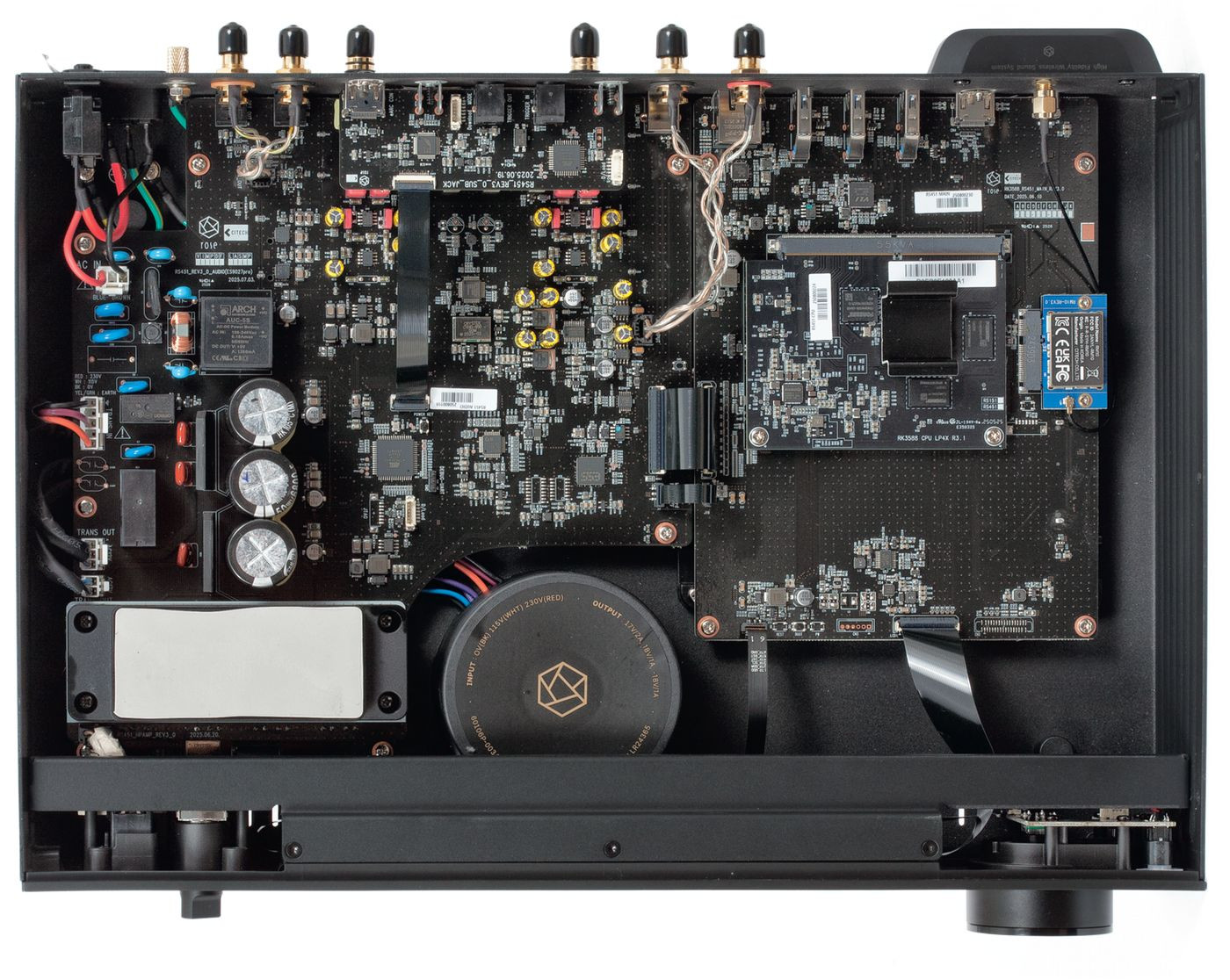 We wnętrzu Rose RS451 zobaczymy kilka płytek drukowanych, które zajmują większość dostępnego miejsca. Zasilanie jest częściowo liniowe, częściowo impulsowe, z niezależnymi obwodami dla różnych sekcji z rozbudowaną filtracją i stabilizacją.