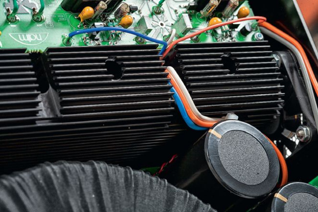 Staje się też jasne, że również w Naimie NAP 250 boczne panele radiatorów pełnią przede wszystkim rolę dekoracyjną. Końcówki mocy znajdują się w części centralnej, na tranzystory wyjściowe przykręcono niewielkie "kostki" lokalnych radiatorów.