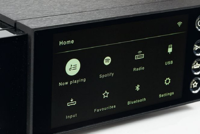 Wyświetlacz prezentuje okładki płyt, nazwy, tytuły utworów. Obok niego umieszczono cztery przyciski – wyboru źródła, sterowania odtwarzaniem, szybkiego dostępu do ulubionych treści (których należy uprzednio nauczyć urządzenie).