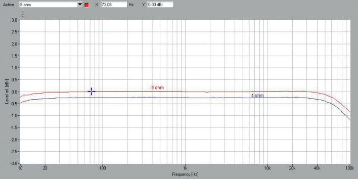 Przy 10 Hz spadek jest śladowy (-0,3 dB), a przy 100 kHz też nieistotny (-1 dB). Weźmy też pod uwagę, co od czasu do czasu warto przypomnieć, że zakres pomiaru znacznie przekracza pasmo akustyczne (nawet dla najzdrowszego ucha to 20 Hz – 20 kHz), więc dyskusja o tym, czy słychać różnicę 1 dB, i tak jest w tym przypadku bezprzedmiotowa. Nie ma również okazji do rozważań, jaka impedancja (4-omowa czy 8-omowa) zapewnia lepszą charakterystykę – są w zasadzie takie same.