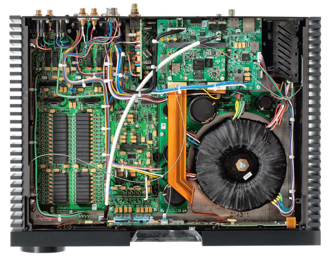 Nieco zaskakująca, chociaż oczywiście korzystna jest obecność bardzo rozbudowanego zasilacza, który zajmuje dużo miejsca blisko przedniej ścianki. Układ jest liniowy, z dużym transformatorem toroidalnym i rozwiniętą filtracją.