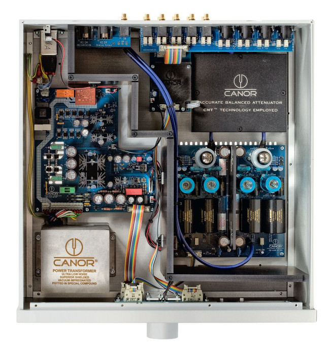 Układy audio podzielono na trzy bloki. Pierwszy (niewielka płytka przy tylnej ściance) przyjmuje sygnały z wejść i je przełącza. Następnie sygnały są przesyłane do regulatora głośności, który Canor przygotował samodzielnie.