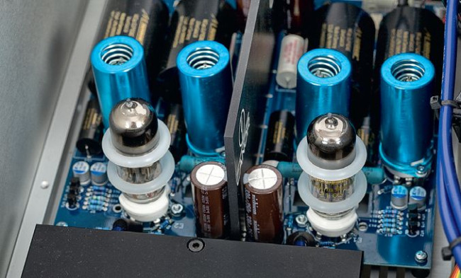 Zbalansowany regulator głośności pozwala sądzić, że sygnały w takiej formie są prowadzone od samych wejść do wyjść XLR. W każdym z kanałów pracują trzy lampy, popularne 6922 (dwie) oraz 6H30 (jedna) – podwójne triody małej mocy, często stosowane w przedwzmacniaczach i stopniach wejściowych wzmacniaczy zintegrowanych. Obok lamp widać ekskluzywne kondensatory sprzęgające Mundorf SilverGold Oil.