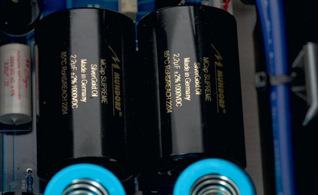 Większość układów wzmacniacza M1 została zmontowana na jednej płytce drukowanej, podobnie jak w przedwzmacniaczu P1 błyszczą kosztowne kondensatory sprzęgające Mundorf SilverGold Oil.