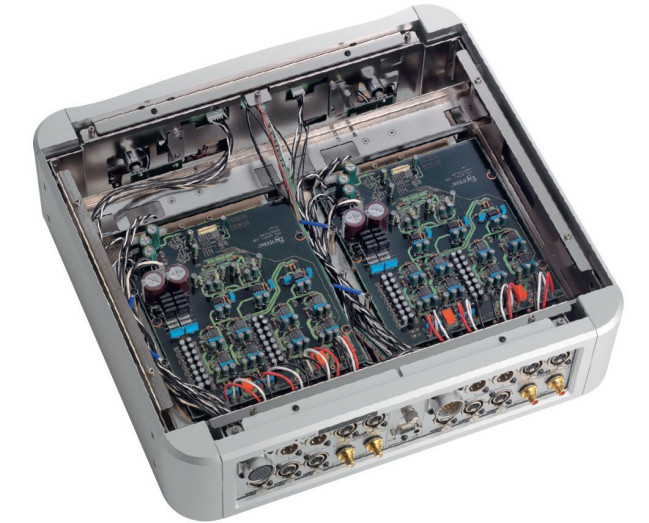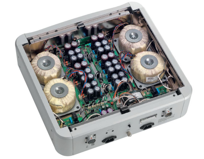 Również tutaj obowiązuje dual mono. Układ jest liniowy, oparty na pięciu transformatorach toroidalnych. Jeden z nich odpowiada za logikę sterowania, pozostałe tworzą duety niezależne dla obydwu kanałów mających nawet oddzielne gniazda zasilające (sterowanie jest podpięte do jednej z nich, ale przecież byłoby szaleństwem, gdyby miało trzecie gniazdko sieciowe...). Rozdzielono też zasilanie obwodów wejściowych i wyjściowych.