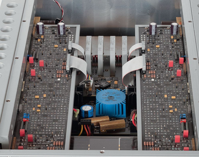 Ale główny zasilacz też dzieli się na dwa – niezależne dla każdego kanału. Aby zredukować negatywny wpływ transformatorów na układy audio, zamknięto je w metalowym kołnierzu (wypełnionym masą tłumiącą), który szczelnie zaspawano. Transformatorowa "tuba" waży 30 kg. Cała ścieżka sygnału jest zbalansowana.