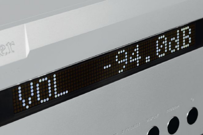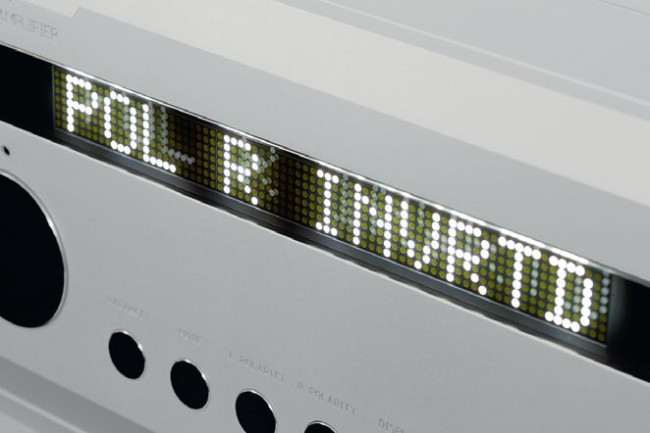 Przez górną część frontu biegnie panel z wyświetlaczem informującym o wzmocnieniu i wybranym wejściu. Regulację głośności prowadzimy pokrętłem umieszczonym w centrum, a źródła przełączamy siedmioma przyciskami z lewej strony. Te po prawej są związane z dodatkowymi funkcjami – zrównoważenia kanałów, zmiany polaryzacji sygnału (niezależnie dla kanału lewego i prawego), regulacji jasności wyświetlacza.