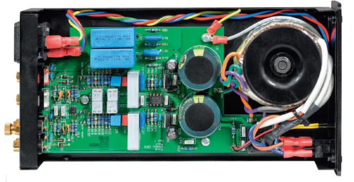 Obudowa Avid Pellar Phono została wykonana z aluminium, stoi na czterech nóżkach z gumowych półsfer. Układ elektroniczny zmontowano na jednej, zajmującej niemal całe dno, płytce drukowanej. Z gniazd wejściowych (niestety, niezłoconych), wlutowanych bezpośrednio do płytki, sygnał biegnie do układu scalonego Texas Instruments OPA 2211, pracującego jako bufor wejściowy i wzmacniacz wstępny.