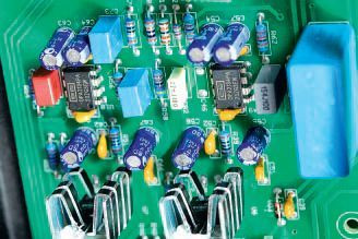 RIAA, albo tzw. "Decca" (bo to nie był standard per se). Na wyjściu sygnał jest buforowany w stojących na nóżkach, chłodzonych niewielkimi radiatorami układach scalonych Linear Technology LT1010. W części korekcyjnej widać precyzyjne oporniki i bardzo dobre kondensatory polipropylenowe.