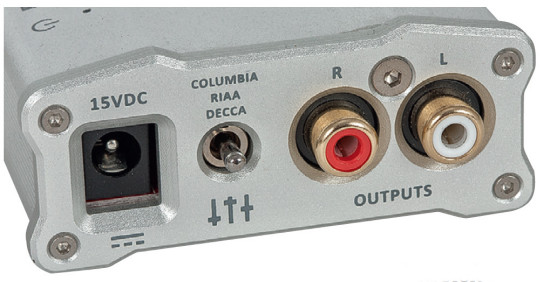 Z drugiej strony, pomiędzy gniazdem zasilającym a wyjściem, mamy hebelkowy przełącznik do wyboru krzywych korekcyjnych w standardach RIAA, Columbia, Decca (więcej w ramce obok).