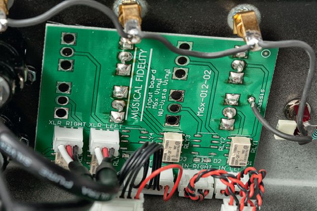 Musical Fidelity zapewnia, że układ jest złożony tutaj wyłącznie z elementów dyskretnych (widać wprawdzie scalone wzmacniacze operacyjne, ale niewykluczone, że pełnią one jakąś pomocniczą rolę). Po wzmocnieniu, korekcji, ew. filtrowaniu sygnały trafiają (znów przewodami) do płytki wyjściowej.