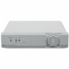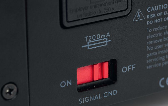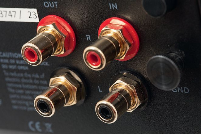 W tak dużej skrzynce zmieściła się oczywiście cała elektronika z zasilaczem. Niewielki przełącznik służy do odcięcia wewnętrznego uziemienia (co może się przydać do eliminacji ewentualnych przydźwięków). Jest jedno wejście i jedno wyjście, gniazda RCA to solidne elementy z masywnymi kołnierzami.