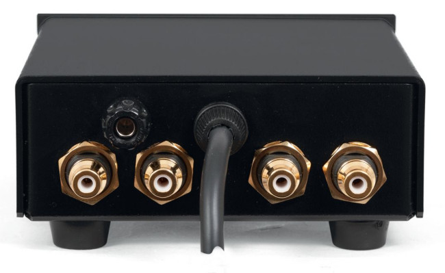 Gniazda RCA (jedna para wejść, jedna para wyjść) są wyjątkowo solidne (z nakrętkami mocującymi). Kabel łączący z zasilaczem jest zainstalowany na stałe.