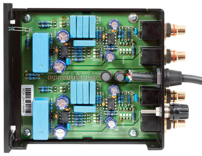 Niewielką obudowę szczelnie wypełnia jedna płytka drukowana, też dokładnie zagospodarowana. Lehmannaudio Black Cube II, tak jak podstawowy Black Cube, to konstrukcja w pełni półprzewodnikowa w sekcji wzmacniającej, z pasywną korekcją krzywej częstotliwościowej i wysokiej jakości elementami biernymi.