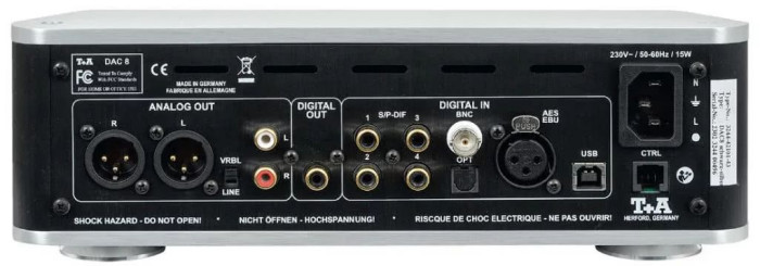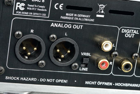 T+A DAC8 ma zarówno gniazda RCA jak i XLR, a na obydwu możemy uzyskać napięcie stałe lub regulowane. Do wyboru trybu pracy służy umieszczony obok hebelkowy przełącznik. Jest również wyjście sygnału cyfrowego w postaci pojedynczego złącza RCA.