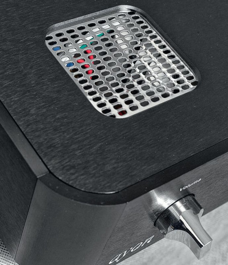 Dwie duże, błyszczące gałki na przedniej ściance to klasyka: wzmocnienie i zmiana wejść. Pomiędzy nimi umieszczono duży, czerwony wyświetlacz typu dot-matrix, pokazujący właśnie, jakie źródło wybraliśmy i jaką głośność ustawiliśmy. Podświetlane na czerwono niewielkie napisy z boku poinformują o typie sygnału wejściowego (PCM lub DSD), wybranym filtrze cyfrowym oraz aktywnym upsamplingu.