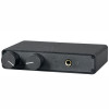 Dwie gałki, o których mowa, służą do regulacji głośności - jedną zmieniamy na wyjściu analogowym (2 x RCA), a drugą na wyjściu słuchawkowym (duży jack 6,3 mm). Między gałką i gniazdem umieszczono dwie białe mikrodiody LED, informujące o tym, jakie wzmocnienie układu wybraliśmy - wysokie czy niskie.