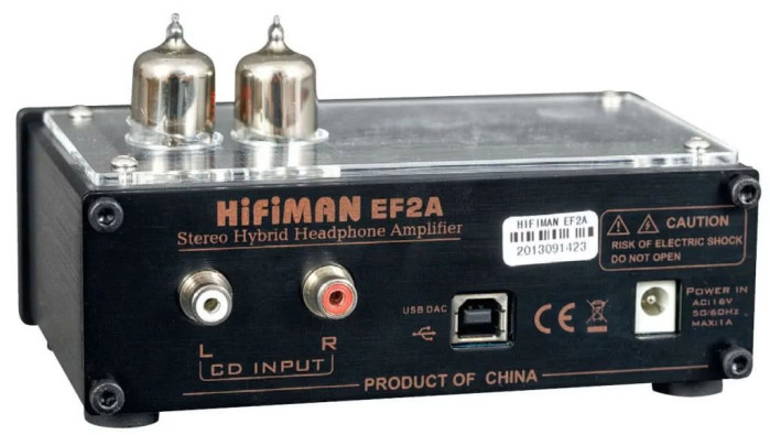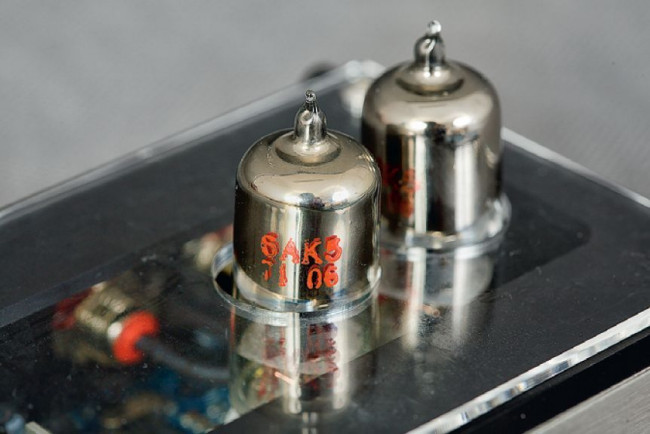HiFiMAN EF2A jest niewielki, ma jednak coś, czego wielu pożąda - dwie lampy (z wystającymi na zewnątrz srebrnymi główkami). To chińskie lampy 6AK5 (6J1), po jednej na kanał, pracujące w układzie bufora wejściowego. Są to miniaturowe pentody z 7-pinowym cokołem, pierwotnie służące do obsługi sekcji RF/IF odbiorników radiowych.