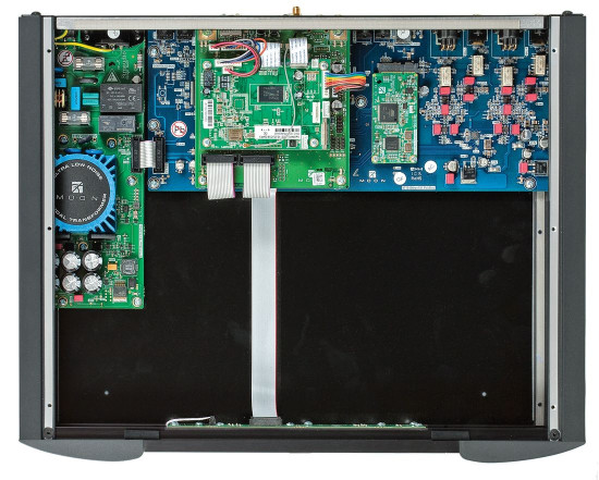 Obudowa nie jest szczelnie wypełniona, układy zmontowane na siedmiu płytkach przysunięto do przedniej i tylnej ścianki. Ważna jest kość konwertera ESS Sabre 9018K2; to wersja dla sprzętu mobilnego, charakteryzująca się wysoką dynamiką (127 dB).