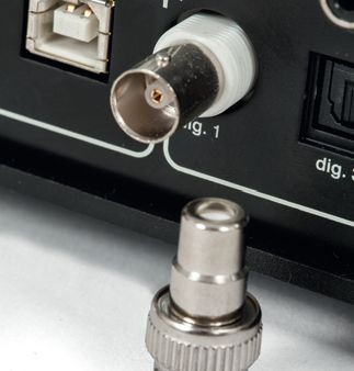 Jedno z gniazd współosiowych to złącze BNC, w komplecie jest jednak przejściówka na standard RCA, chociaż i takich (są dwa) w DAC V1 nie brakuje