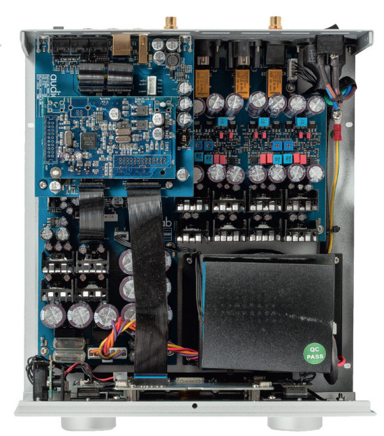 Chociaż nie uniknięto połączeń przewodami, to wnętrze zostało starannie zaaranżowane, wydzielono sekcję wejść USB i sterowania, przetwornik C/A znajduje się piętro niżej. Podstawą rozbudowanego zasilacza jest transformator toroidalny.