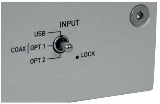 Z przodu tylko to, co niezbędne: włącznik zasilania oraz selektor wejść, obydwa w postaci miniaturowych przełączników hebelkowych. Nie ma nawet typowych wskaźników, a zaledwie dwie diody. Pierwsza sygnalizuje pracę urządzenia, druga - o nazwie "Lock" - potwierdza rozpoznanie sygnału cyfrowego i spięcie przetwornika ze źródłem.