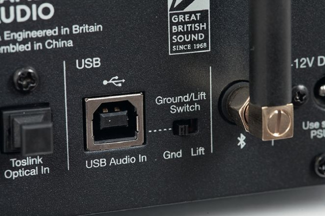 Przy gniazdku USB widać dodatkowy wyłącznik pozwalający na odcięcie masy (przydatne w rzadkich sytuacjach, kiedy pojawiają się przydźwięki). Ponieważ DacMagic 200M ma moduł Bluetooth (kodowanie aptX), a obudowa jest w całości metalowa, więc trzeba było zainstalować gniazdo dla anteny (jest w komplecie).