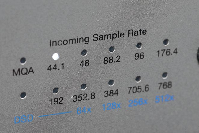 Prawą część frontu zajmuje diodowy wskaźnik parametrów sygnału cyfrowego; można odczytać częstotliwość próbkowania dla PCM, wariant transmisji DSD, a także potwierdzić obecność sygnałów MQA.