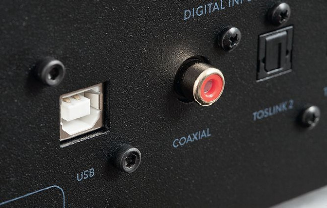 Na tylnej ściance przetwornika Fezz Audio Equinox EVO znajdują się cztery gniazda wejściowe, dwa optyczne, jedno współosiowe i jedno USB-B. Wyjścia są wyłącznie analogowe, w standardzie RCA.