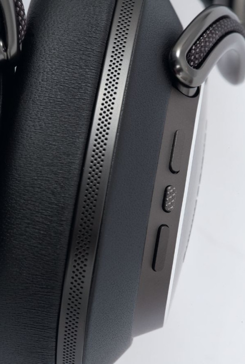 Słyszałem, że B&W wahało się, czy obsługi słuchawek nie powierzyć nowoczesnym sensorom dotykowym, ale ostatecznie wybrało tradycyjne przyciski. Część z nich znajduje się na lewej muszli: włącznik zasilania wraz z aktywacją trybu parowania oraz selekcja trybów ANC/ transparentności; pozostałe, związane ze sterowaniem i odtwarzaniem muzyki – na prawej. Przyciski są niewielkie i sięgamy do nich od tyłu głowy, do czego trzeba się przyzwyczaić.