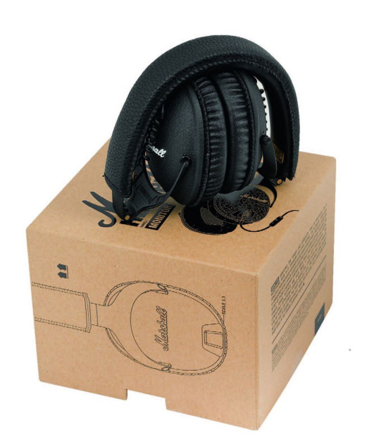 Słuchawki Marshall Monitor zamknięto w eko-szarym pudełku, przypominającym opakowania firmowych wzmacniaczy, oczywiście o odpowiednio mniejszych gabarytach.