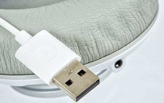 Pozostaje jeszcze trzeci przewód, najbardziej zagadkowy, bo z jednej strony ma wtyk 2,5 mm (do słuchawek), a z drugiej… USB, służący do ładowania ogniw umieszczonych wewnątrz słuchawek. Mamy więc coś wyjątkowego.