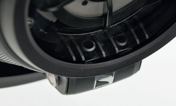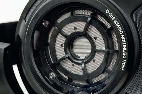 Efektowne kosze przetworników można oglądać z tyłu muszli zamkniętych przezroczystymi panelami; ich wyprofilowanie służy odprowadzeniu fali dźwiękowej do zewnętrznych części ustroju, gdzie znajdują się dwie komory wytłumiające.