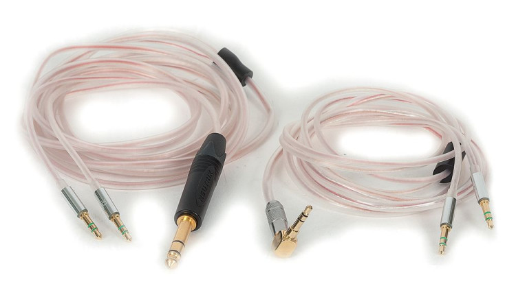 W komplecie są dwa kable: jeden półtorametrowy, zakończony wtyczką kątową 3,5 mm (mini-jack), z dodatkiem przejściówki na 6,3 mm (duży jack); drugi dwuipółmetrowy, zakończony na stałe wtyczką 6,3 mm.