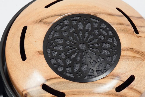 Efektowne muszle wykonano z egzotycznego drewna Maple Ambrosia, centralny otwór przesłonięto wzorzystą siateczką.