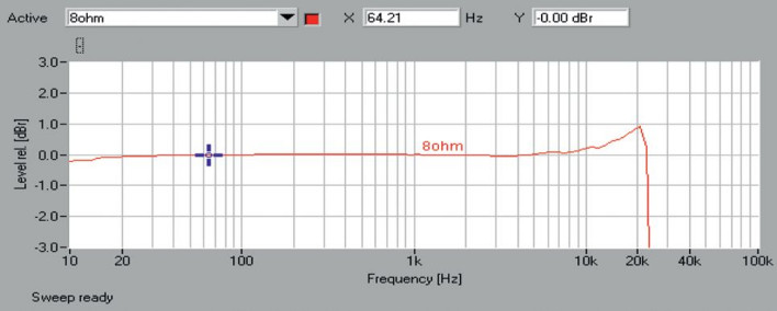 W pasmie przenoszenia (rys.1) widać konsekwencje specyfiki tej konstrukcji. Na okolice 20 kHz przypada szczyt lokalnego wzbudzenia, powodowanego działaniem filtrów rekonstrukcyjnych na wyjściu układu, a potem szybki spadek. W spektrum zniekształceń (rys. 2) dominują nieparzyste, najsilniejsza trzecia przy -65 dB, piąta przy -71 dB i siódma przy -79 dB, powyżej -90 dB leżą jeszcze dziewiąta, trzynasta i piętnasta.