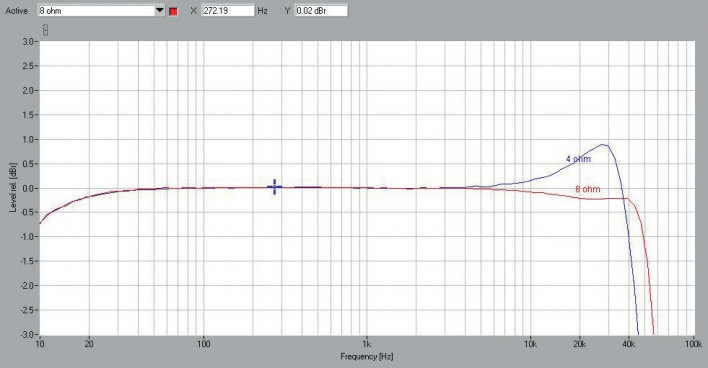 Dla wzmacniacza impulsowego trudnym sprawdzianem jest pomiar charakterystyk przetwarzania (rys.1) ze względu na wpływ fi ltrów wyjściowych. Tym razem lepiej wygląda wariant 8-omowy, aż do 40 kHz napięcie utrzymywane jest w granicach -0,2 dB.