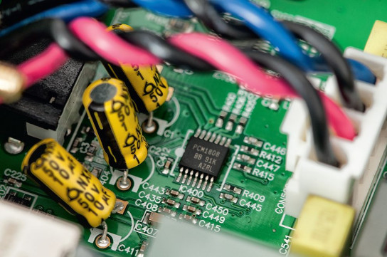 W pobliżu wejścia analogowego widać przetwornik A/C Burr Brown PCM1802 (24/96), który sugeruje, że przedwzmacniacz (z sekcją procesorów) jest cyfrowy. Te podejrzenia się potwierdzają, gdy napotykamy na wielozadaniowy układ scalony Merus Audio MA12070P.