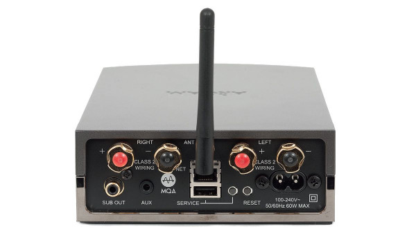 Zaciski głośnikowe zaskakują solidnością (metalowe, z nakrętkami). Pomiędzy nimi zainstalowano gniazdo anteny Wi-Fi i złącze sieciowe LAN. Jest też USB-A, ale jedynie do funkcji serwisowych.