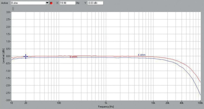 Oczekujemy więc mocy 2 x 50 W przy 8 Ω i 2 x 75 W przy 4 Ω, co w pomiarach zostało wykonane z zapasem, zarówno przy wysterowaniu jednego kanału (55 W przy 8 Ω i 92 W przy 4 Ω), jak i w trybie stereofonicznym (odpowiednio 2 x 51 W i 2 x 79 W).