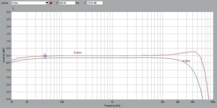 Mimo to, dzięki wysokiej mocy, dynamice udaje się dotrzeć do 92 dB. Na rys. 1. widać, że impedancja obciążenia ma wpływ na charakterystykę przenoszenia, co też jest typowe dla wzmacniaczy impulsowych i wynika z działania fi ltrów wyjściowych, jednak tym razem problem jest zredukowany, charakterystyka dla 8 Ω ma tylko śladowe (+0,3 dB) podbicie powyżej 20 kHz i spadek -3 dB przy wysokich 80 kHz; dla 4 Ω nie ma podbicia i opada wcześniej (-3 dB przy 62 kHz).