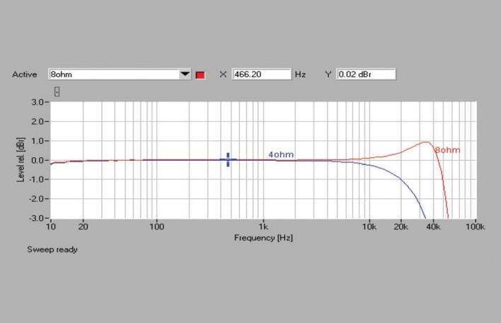 Nie pozwala o niej zapomnieć pomiar pasma przenoszenia (rys.1) wskazujący na wpływ filtrów wyjściowych, zależny od impedancji obciążenia. Dla 8 omów mamy lekkie wzmocnienie przy 35 kHz, a dla 4 omów wcześniejsze opadanie i -3 dB przy 33 kHz.