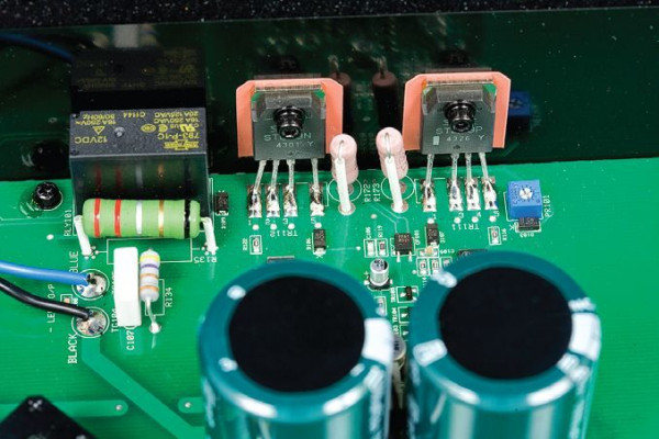 Sygnał audio przesyłany jest z okolic wejść (i regulatora wzmocnienia) do końcówek mocy przewodami. Dość duży radiator umieszczono tuż przy prawej ściance obudowy, i tam wzmacniacz nagrzewa się najmocniej. W każdym kanale pracuje para układów (Darlingtona) Sanken STD03N/P. To ponownie jedne z ulubionych komponentów producenta, stosowanych (w innych konfiguracjach) w modelach M6.