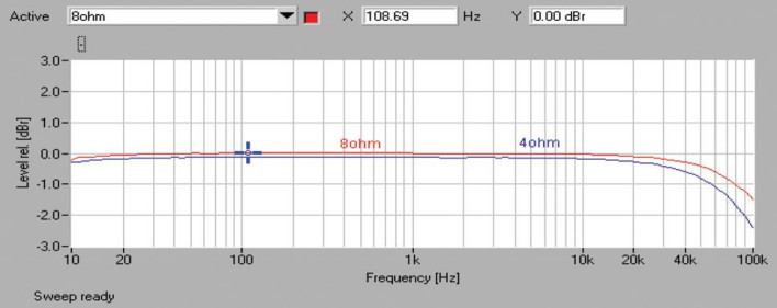 Szumy nie będą przeszkadzać, S/N wynosi 86 dB a dynamika osiąga 105 dB. 8300A bardzo dobrze przeszedł test pasma przenoszenia (rys.1), przy 10 Hz oferuje idealną liniowość, a przy 100 kHz spadek wynosi -1,3 dB dla 8 omów i -2,4 dB dla 4 omów. Na rys. 2. widać wprawdzie sporo harmonicznych nieparzystych, jednak nawet najmocniejsza z nich – trzecia – ma bardzo niski poziom -90 dB, a kolejne leżą w okolicach -100 dB.