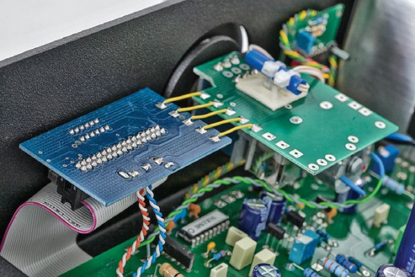 Wiąże się z nim spora liczba połączeń kablowych, jest ich zresztą w sumie jeszcze więcej, były też niezbędne, aby przejść sygnałem na niezależną płytkę z regulatorem wzmocnienia (niebieski Alps), wrócić znowu do modułu selektora wejść, skąd sygnał przesyłany jest na główny druk z aktywnymi stopniami wejściowymi i końcówkami mocy.
