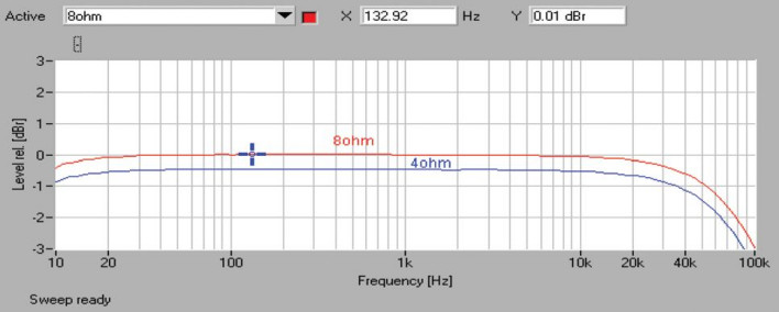 W pasmie przenoszenia (rys.1) notujemy nieznaczny spadek przy 10 Hz i nieco wyraźniejsze obniżenie przy 100 kHz, ok. -3 dB dla 8 i odrobinę więcej dla 4 omów.