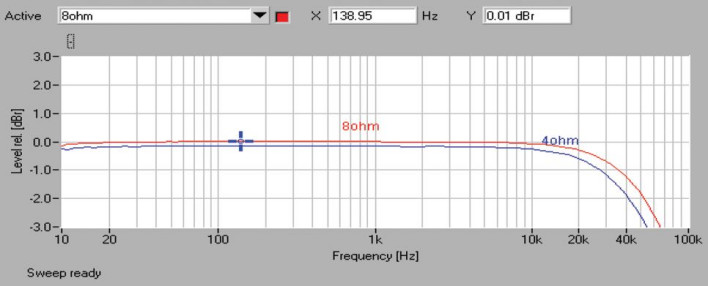 Ciekawa jest dość niska czułość, wynosząca niemal 1 V – można sobie na to pozwolić wobec poziomu sygnału wyjściowego ze współczesnych źródeł (ograniczając przy tym ilość stopni wzmacniających, co jest dla Passa bardzo ważne); nie powinno tylko dziwić to, że regulator wzmocnienia będzie mocno "odkręcany". Stosunek S/N jest dobry (88 dB), dynamika osiąga 107 dB. Charakterystyka przenoszenia (rys.1) jest idealna w zakresie niskich częstotliwości, natomiast przy górnej granicy pasma akustycznego (20 kHz) rozpoczyna się spadek, -3 dB można wyznaczyć przy 62 kHz przy 8 omach oraz 52 kHz przy 4 omach.