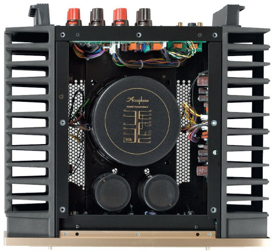Za zasilanie odpowiada potężny, zaekranowany transformator toroidalny z dwoma dużymi kondensatorami filtrującymi z logo Accuphase`a (produkcji Nichicona). Każdy kanał ma swoje uzwojenia wtórne, osobno zasilana jest też sekcja wejściowa.